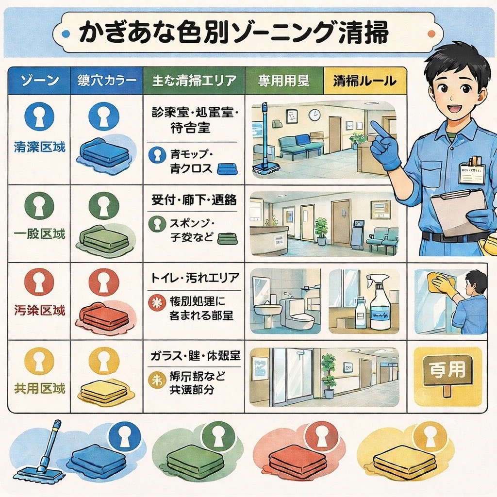 - この施設では、清掃エリアごとに「かぎあな色」で道具を分けるゾーニング清掃を行っています。