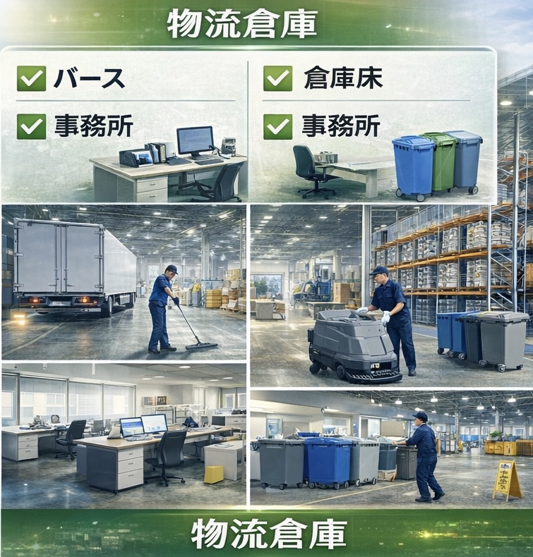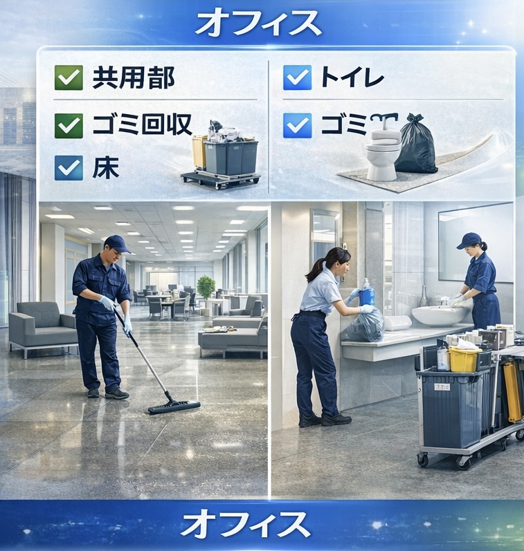 具体的には、以下の内容が含まれます。 - ●机、椅子、床などの基本的な清掃 ●トイレ、キッチンなどの水回りの清掃