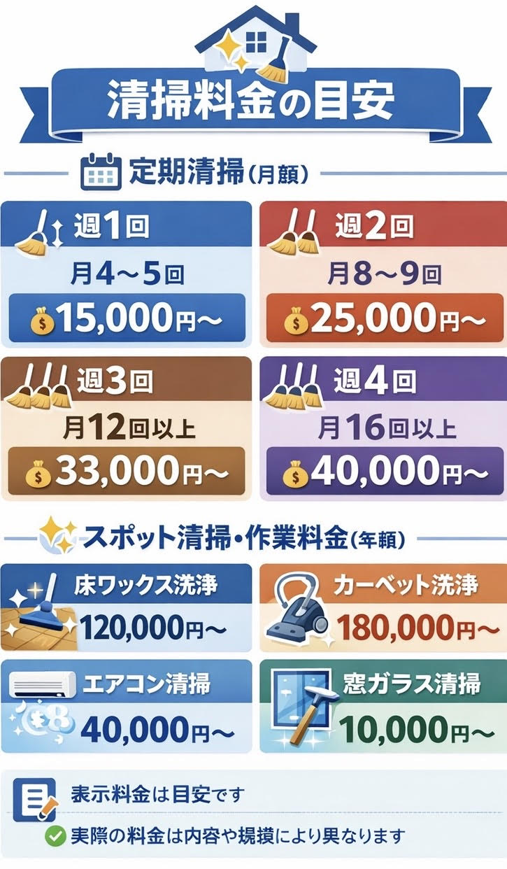 - これらの料金は目安ですので、実際の料金は清掃業者によって異なる場合があります。
