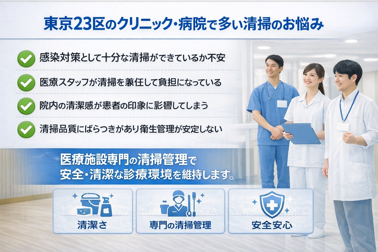 床や設備を徹底清掃し、清潔で安全な医療環境を保ちます